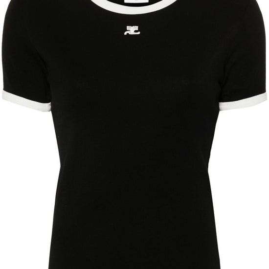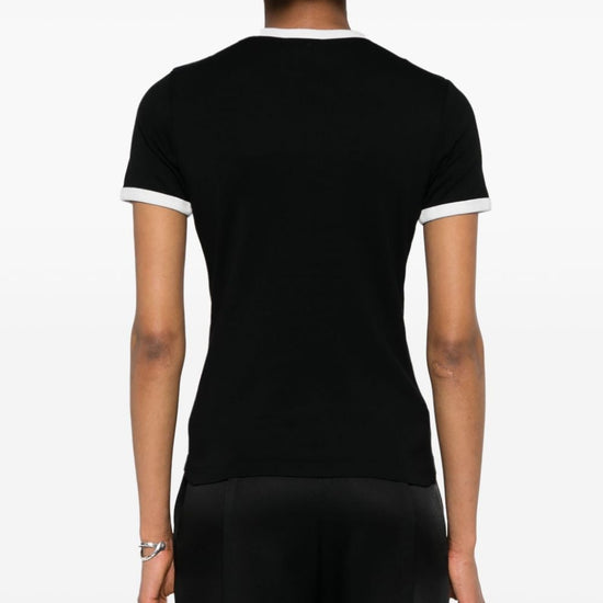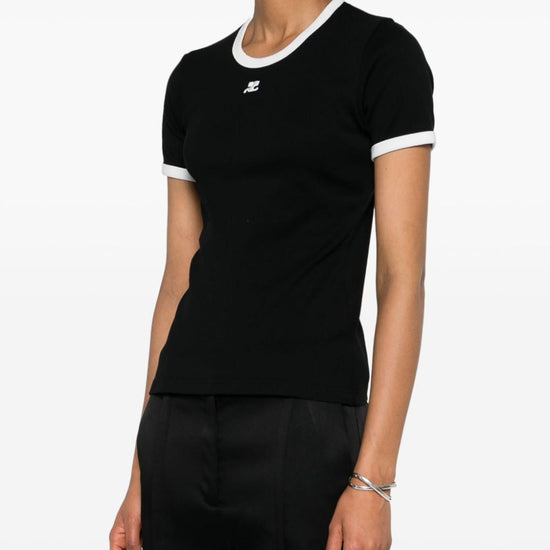 Black cotton jersey texture ribbed contrasting borders crew neck short sleeves logo patch to the front straight hem cotton t-shirt