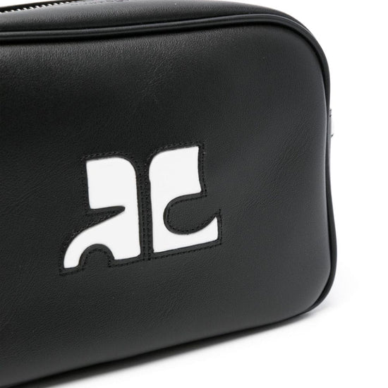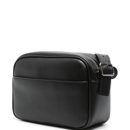 Black calf leather smooth grain embroidered logo to the front top zip fastening adjustable detachable shoulder strap slip pocket to the rear main compartment debossed internal logo internal zip-fastening pocket full lining silver-tone hardware this piece comes complete with a protective dust bag. leather camera bag size and fit - width 7,09 in / 18 cm