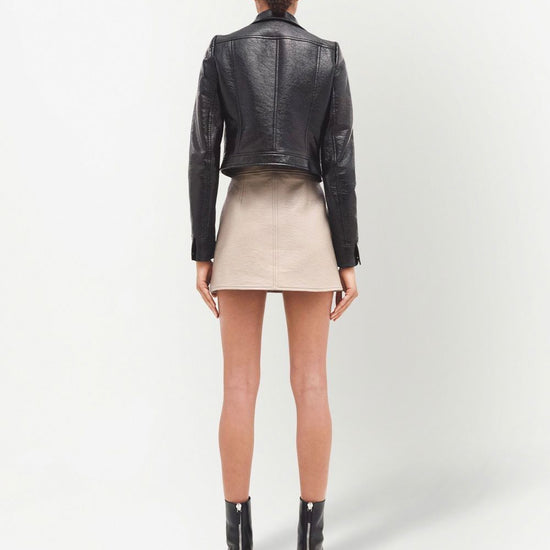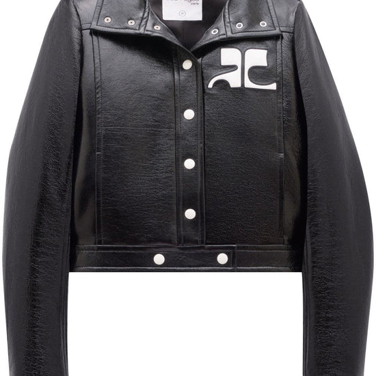 Iconique vinyl jacket from courrèges featuring black/white, stretch-cotton, logo patch to the front, front press-stud fastening and long sleeves. faux leather jacket