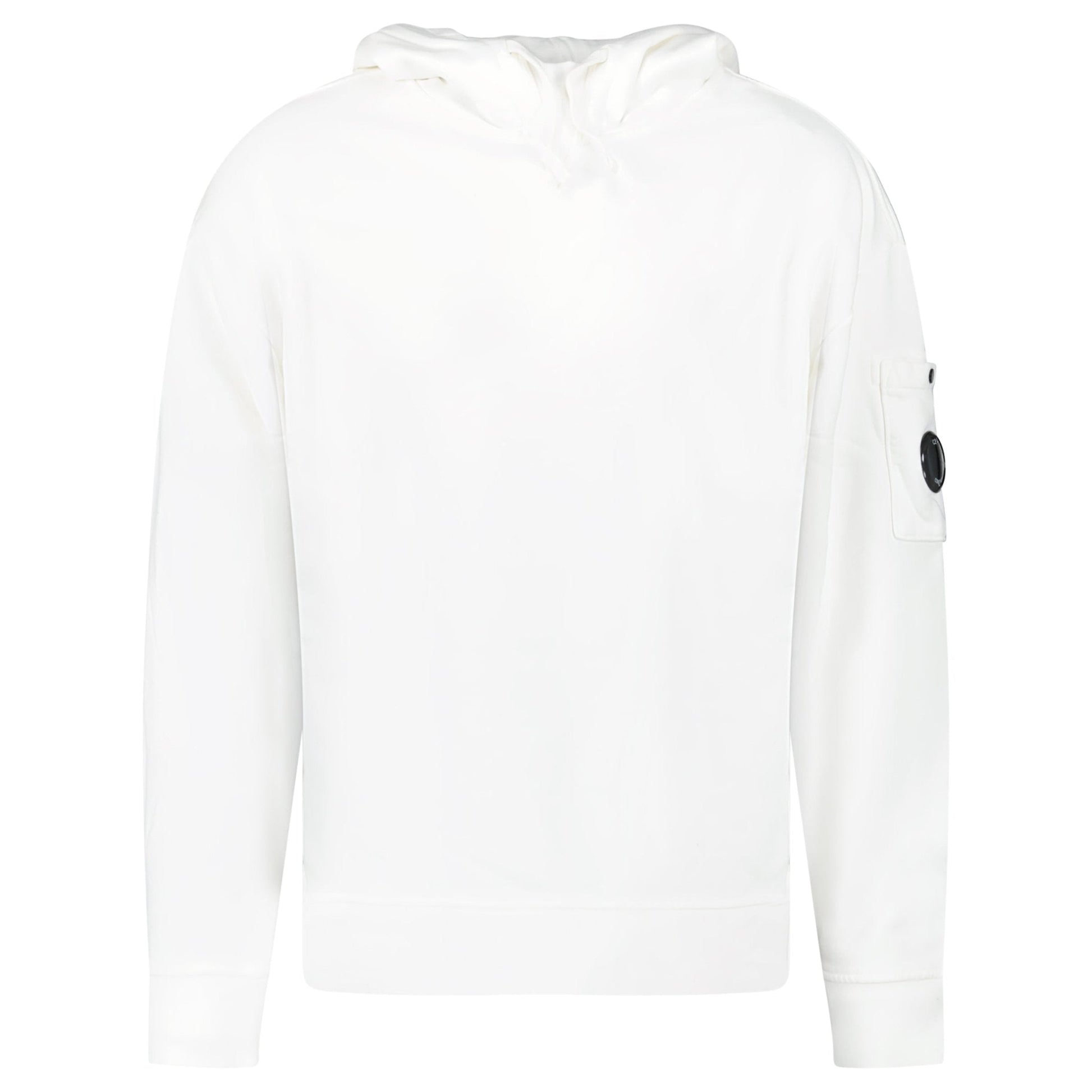 elevate your casual rotation with the cp company logo hoodie in white. crafted from premium cotton, this hoodie combines modern design with everyday comfort. featuring a drawstring hood, spacious front pocket, and the brand’s signature sleeve pocket with button-flap closure, it embodies c.p. company’s functional yet stylish aesthetic. finished with ribbed trims and a straight hem, it’s a versatile piece perfect for contemporary streetwear looks.