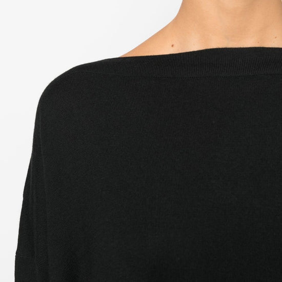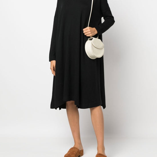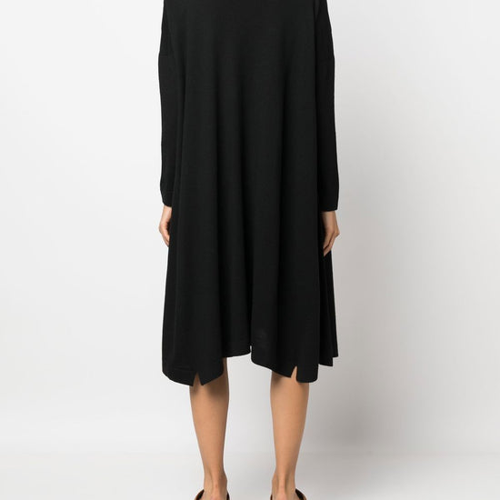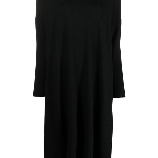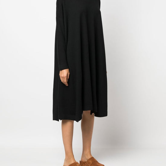 Flared knitted dress from daniela gregis featuring black, wool, flared, knitted construction, boat neck, drop shoulder and long sleeves. oversized wool short dress size and fit - this piece fits true to size. we recommend you get your regular size. model is 1,75m / 5ft 8in wearing size uni
