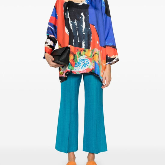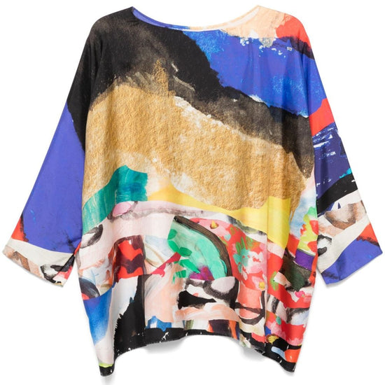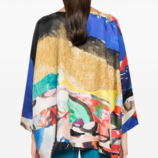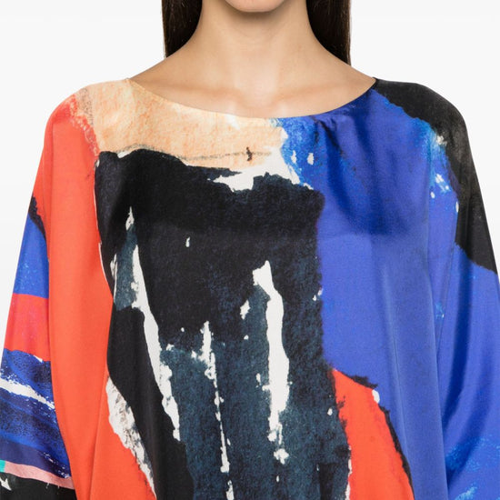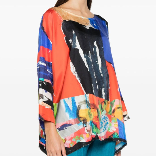 Blue/multicolour silk abstract pattern print round neck long sleeves straight hem printed silk blouse size and fit - this piece fits true to size. we recommend you get your regular size. model is 1,75m / 5ft 8in wearing size uni