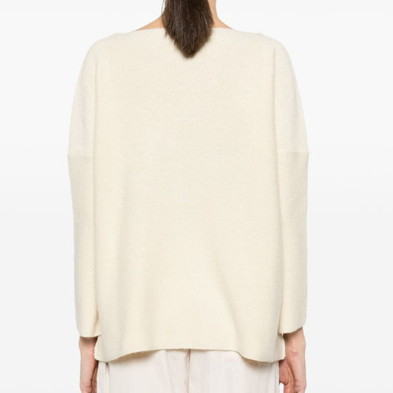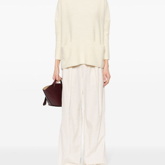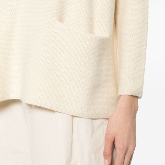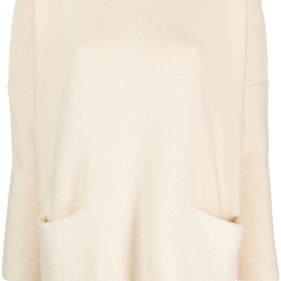Light beige yak knitted construction boat neck drop shoulder long sleeves two front jetted pockets straight hem mandolino lavato wool boatneck sweater size and fit - this piece fits true to size. we recommend you get your regular size. model is 1,75m / 5ft 8in wearing size uni
