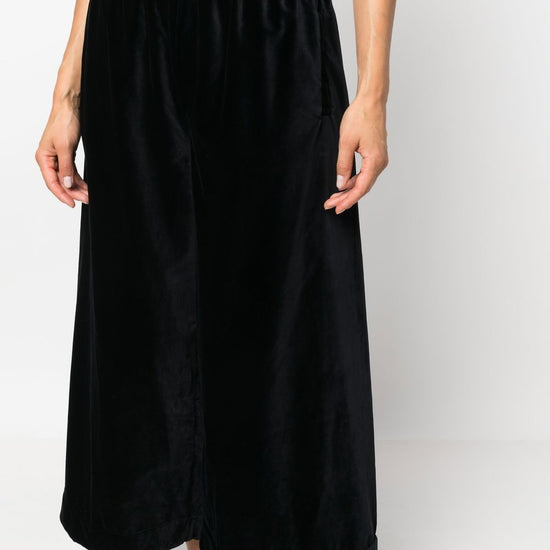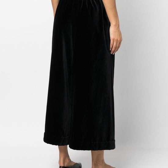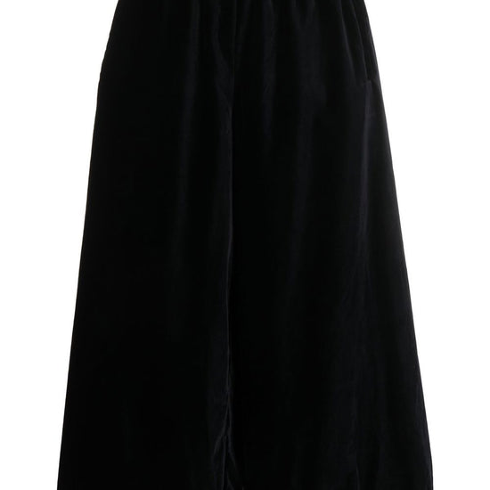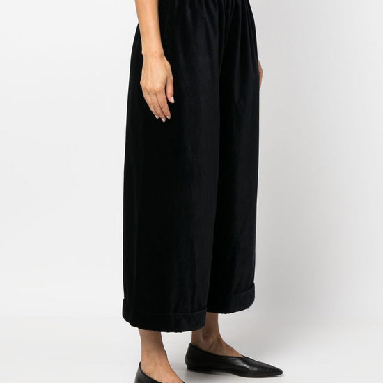 Navy blue cotton velvet elasticated waistband cropped wide leg cotton pajama trousers size and fit - back rise: 37.0 centimetres. front rise: 30.0 centimetres. hem width: 70.0 centimetres. hips: 70.0 centimetres. inside leg: 65.0 centimetres. waist: 110.0 centimetres.