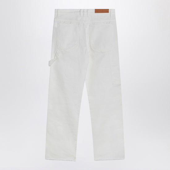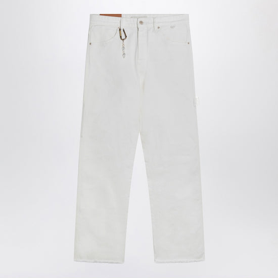 Darkpark pants in white cotton denim, featuring a front zip and button closure, belt loops, removable logo keychain, two front pockets, two back pockets, raw hem, and back logo patch. size and fit - model wears size 32 model measurements: height: 185 cm chest: 105 cm waist: 85 cm hips: 100 cm