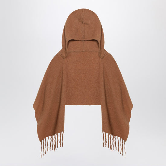 Brown wool and cashmere cape by destin surl, featuring hood and fringed edges.