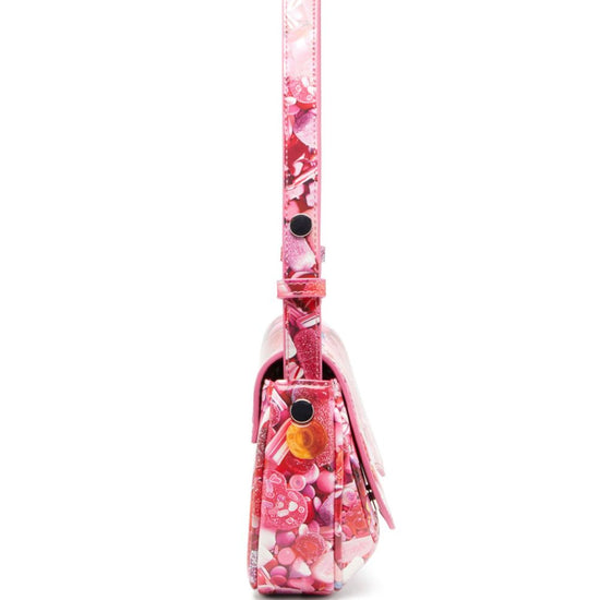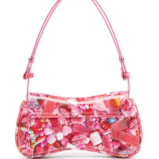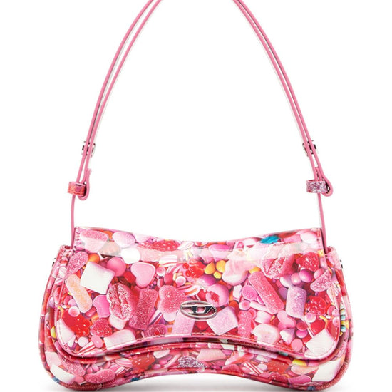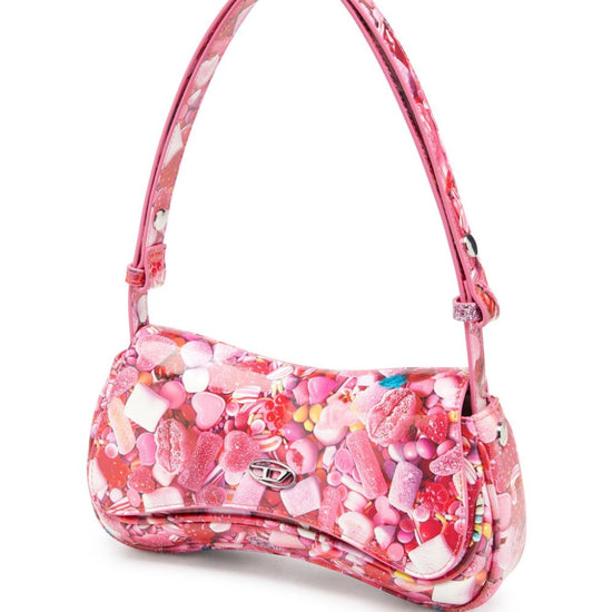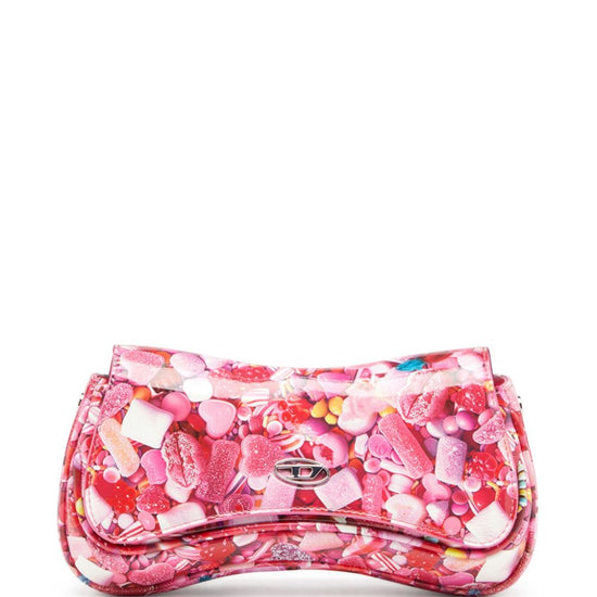 Pink faux leather all-over graphic print foldover top with magnetic fastening single shoulder strap silver-tone logo plaque main compartment internal zip-fastening pocket internal logo patch full lining play clutch size and fit - width 10,24 in / 26 cm