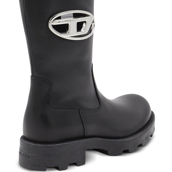 Black leather upper silver-tone logo plaque side zip fastening round toe chunky rubber sole leather biker boots