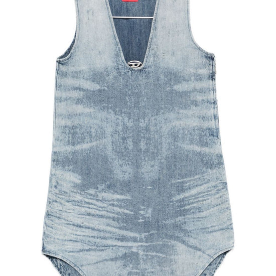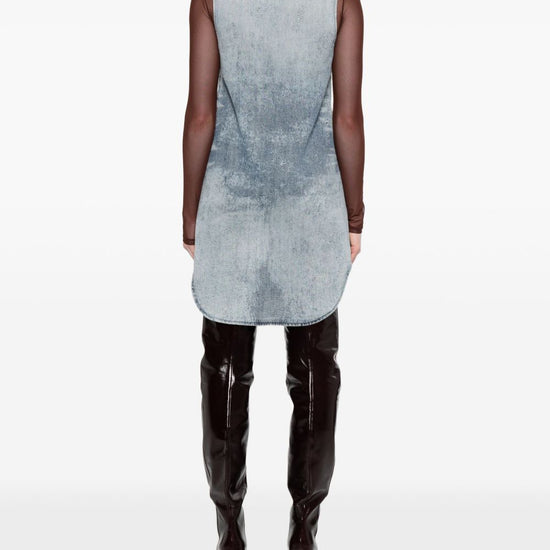 Light blue acid-wash effect v-neckline sleeveless curved hem denim short dress