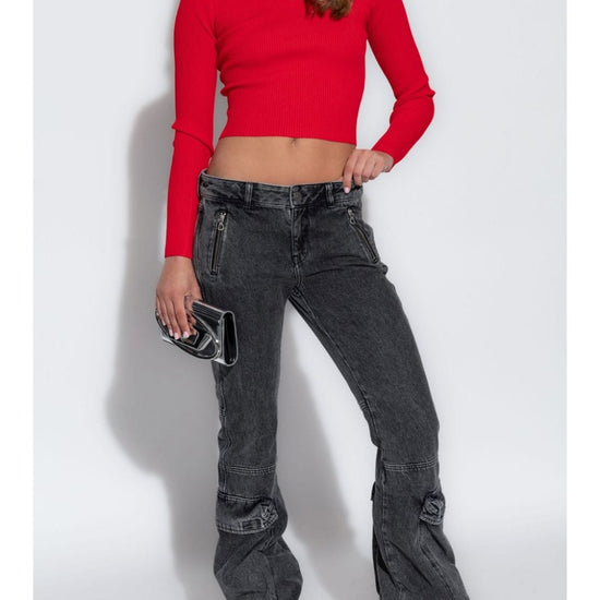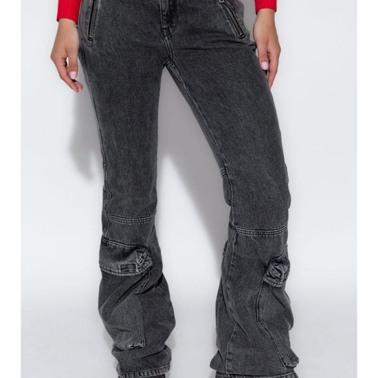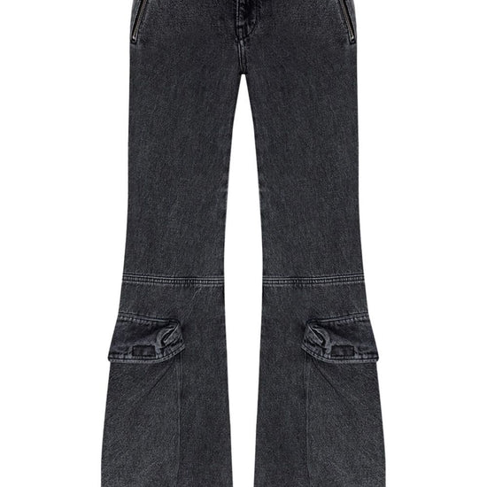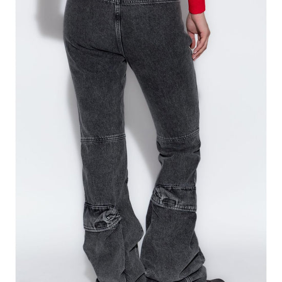Grey cotton denim flared front button fastening belt loops two side zip-fastening pockets logo patch to the rear flared denim cotton jeans size and fit - this piece fits true to size. we recommend you get your regular size. model is 1,75m / 5ft 8in wearing size 27 (waist cm)