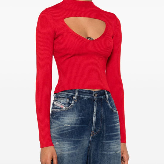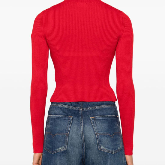 Red wool ribbed texture long sleeves logo detail wool cut-out sweater