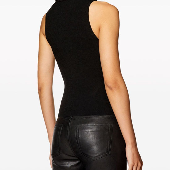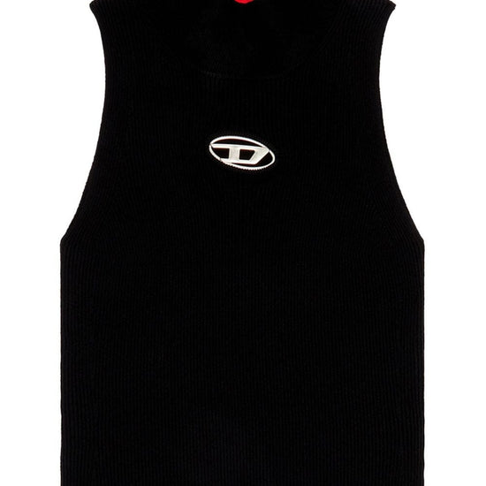 Black ribbed knit silver-tone logo plaque cut-out detailing high neck sleeveless straight hem m-onervax tank top size and fit - this piece fits true to size. we recommend you get your regular size. model is 1,75m / 5ft 8in wearing size s