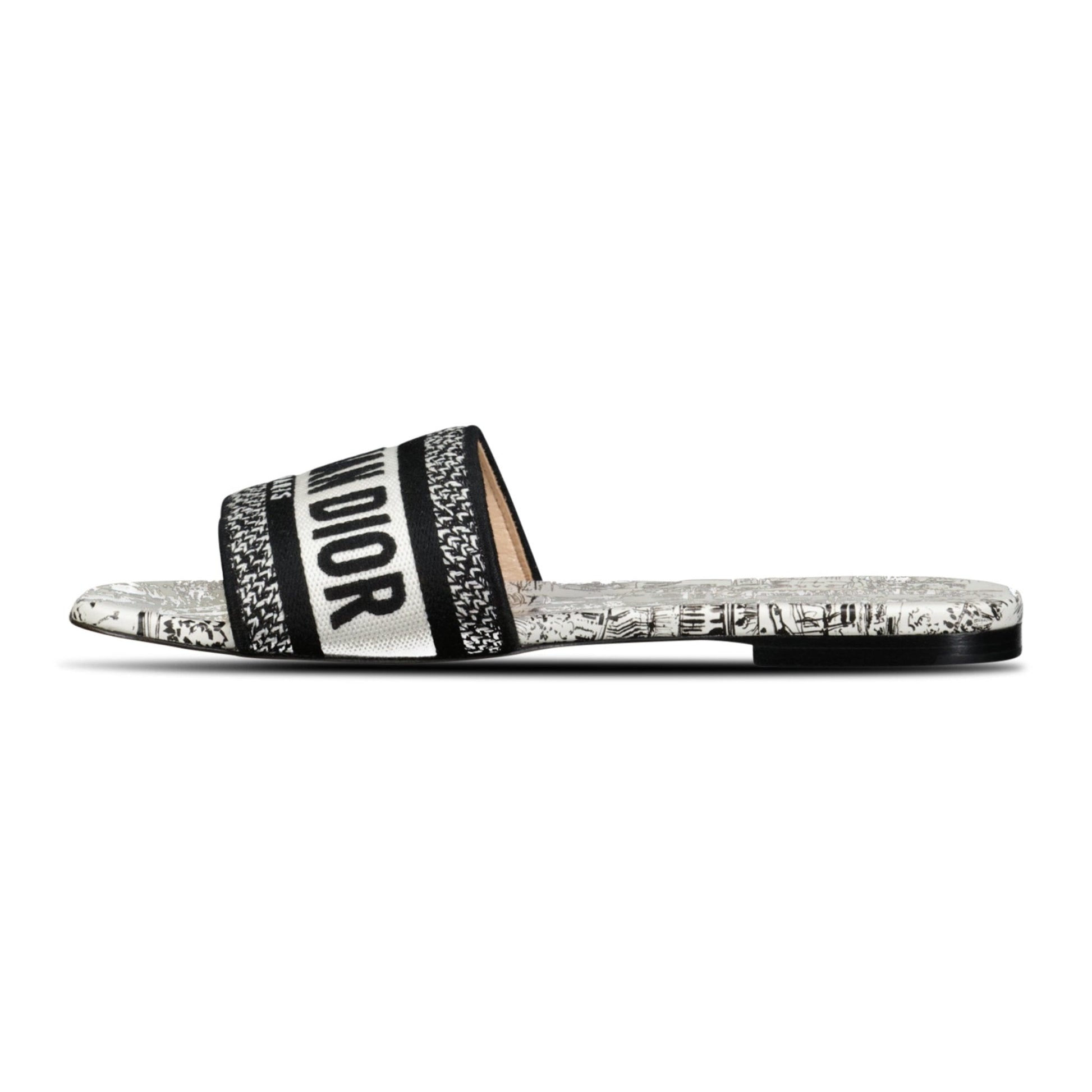elevate your wardrobe with the dior d-way slide calfskin sandals in white & black. crafted with a timeless and emblematic silhouette, these slides bring an effortless touch of elegance to any outfit. the blue cotton denim upper is embroidered with the iconic christian dior paris signature, adding a touch of sophistication to the streamlined design. perfect for easy wear, these slides offer both style and comfort.