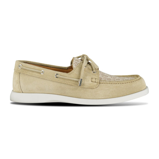 perfect to style smart to casual, the dior granville boat shoe in beige suede offers a relaxed version of a timeless silhouette. crafted in luxurious and ultra-soft beige suede, the style is adorned with a beige dior oblique jacquard insert on the vamp. completed by a cream lightweight rubber sole, the shoe is enhanced by the engraved dior oblique motif on the outsole and the dior signature engraved on the rear. this lace-up shoe will lend an elegant touch to casual looks.