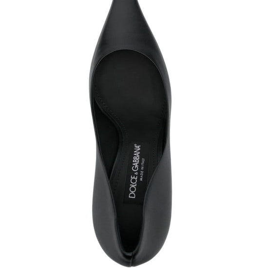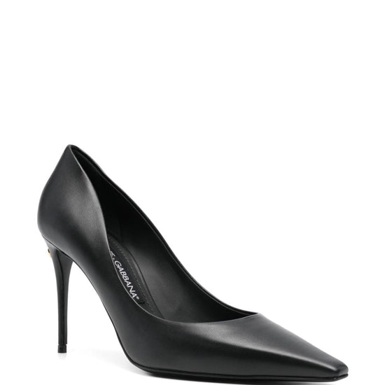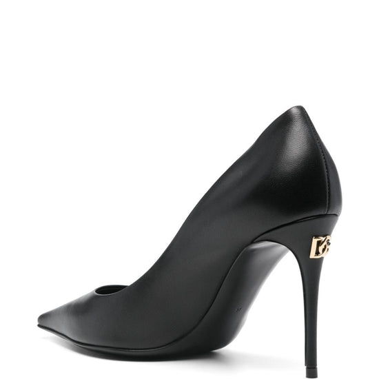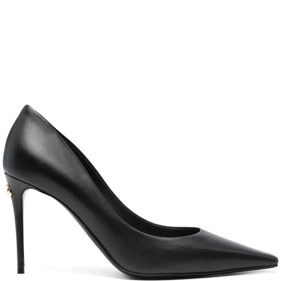 Black calf leather smooth grain 95mm high stiletto heel gold-tone logo plaque pointed toe branded leather insole leather sole leahter pumps size and fit - heel 3,5 in / 9 cm