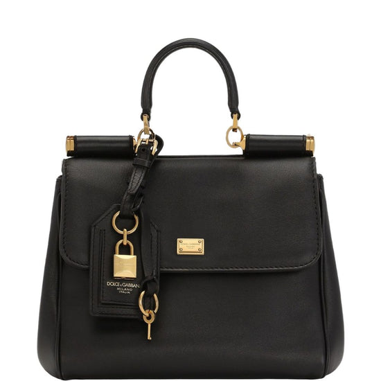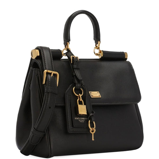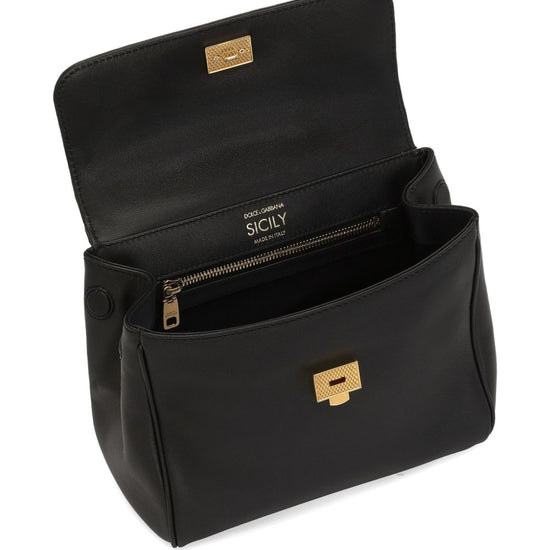 Black gold-tone hardware detachable shoulder strap lock and key detail top handle logo plaque sicily soft leather handbag