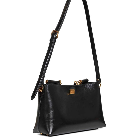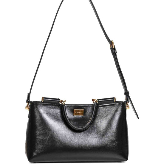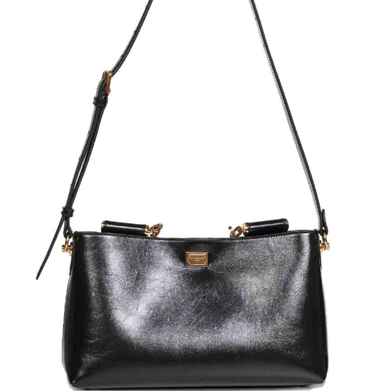 Black shiny finish gold-tone logo tag front and back single rounded handle adjustable shoulder strap vittoria leather handbag size and fit - depth 4 cm. height 20 cm. width 39 cm.