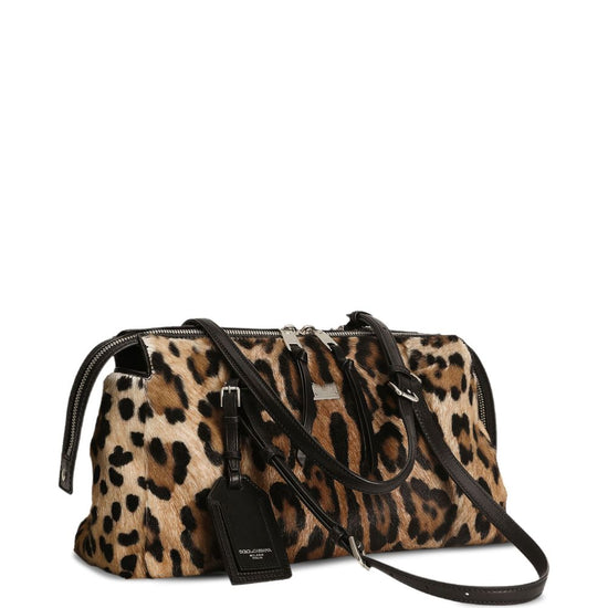 Brown animal print two shoulder straps top zip closure leather charm back zip pocket vittoria leo print handbag
