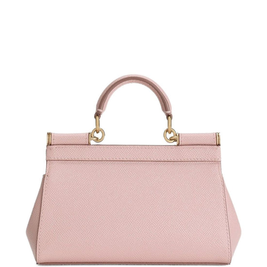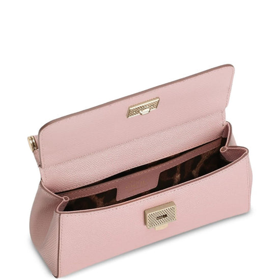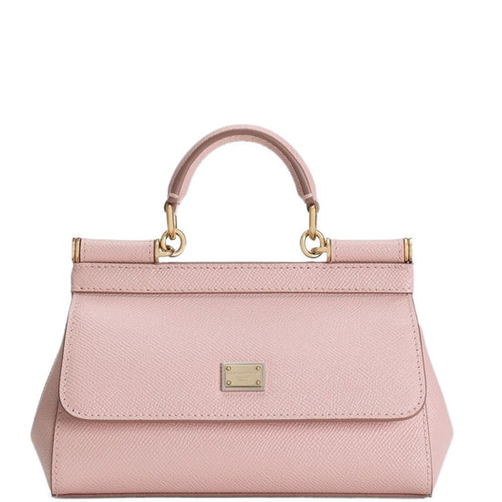 Powder pink top handle gold-tone hardware logo plaque internal slip pocket magnetic fastening sicily small leather handbag