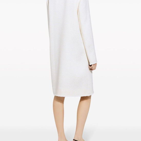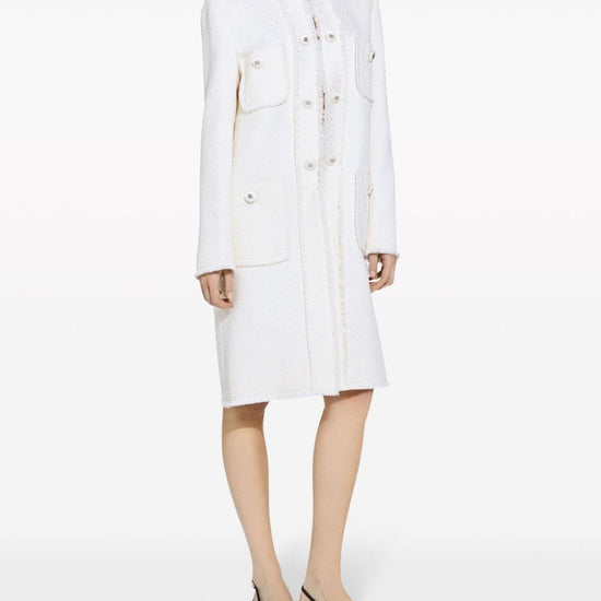 White tweed frayed edge crew neck concealed front fastening long sleeves four front patch pockets knee-length straight hem wool tweed coat size and fit - this piece fits true to size. we recommend you get your regular size. model is 1,75m / 5ft 8in wearing size 40 (it)