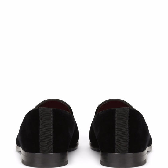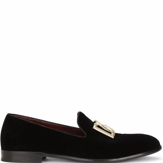 Black cotton velvet dg-plaque velvet slippers from dolce & gabbana featuring gold-tone logo lettering, almond, slip-on style, silk lining, branded insole and flat leather sole. velluto logo velvet loafers size and fit - heel 0,6 in / 1,5 cm