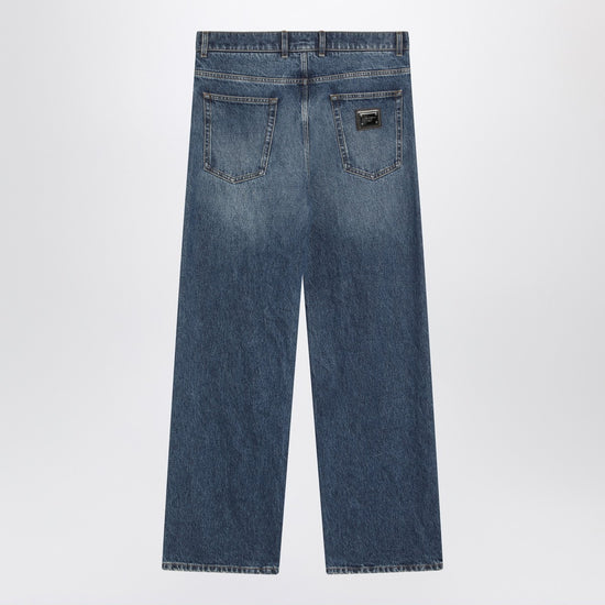 Dolce & gabbana blue washed-effect cotton denim jeans, featuring front zip and button closure, belt loops, small lettering logo patch on the front, five classic pockets, branded metal tag on the back, front pleats and oversized fit. size and fit - model wears size 50 it model measurements: height: 189 cm chest: 104 cm waist: 78 cm hips: 95 cm