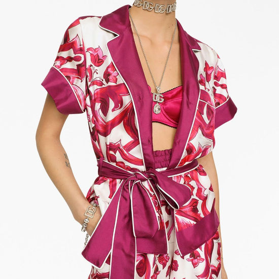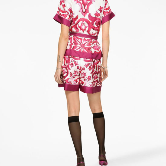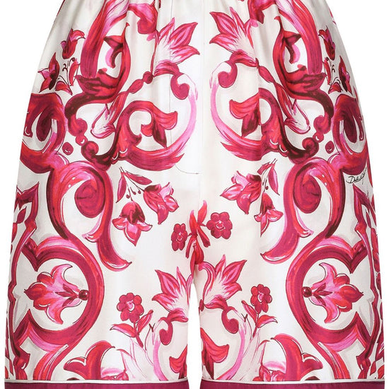 Majolica-print silk short from dolce & gabbana featuring pink, white, silk, majolica print, high waist, elasticated waistband, straight hem and above-knee length. size and fit - this piece fits true to size. we recommend you get your regular size. model is 1,75m / 5ft 8in wearing size 40 (it)