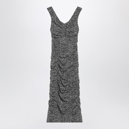 Midi dress by dolce & gabbana in silk blend with black and white diagonal print, featuring a fitted draped design, off-the-shoulder style, and a zip closure at the back. size and fit - model wears size 40 it model measurements: height: 178 cm chest: 83 cm waist: 63 cm hips: 91 cm