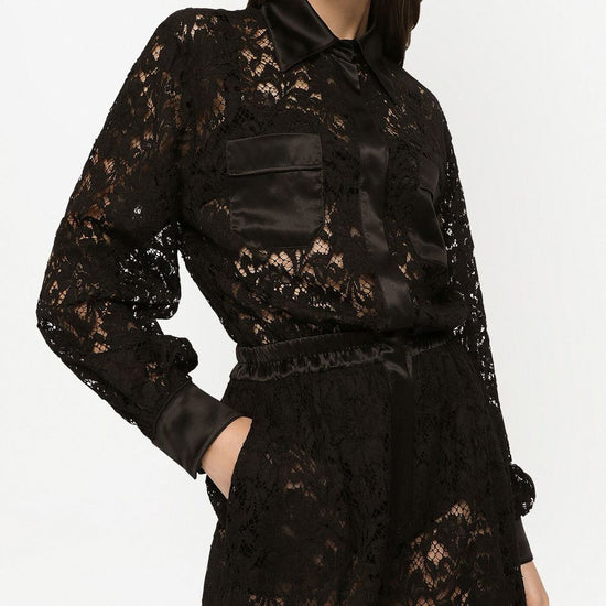 Lace-trim long-sleeve jumpsuit from dolce & gabbana featuring jet black, silk-cotton blend, lace trim, semi-sheer construction, classic collar, concealed front button fastening, long sleeves, buttoned cuffs, elasticated waistband, two chest patch pockets and straight leg. lace long shirt jumpsuit size and fit - this piece fits true to size. we recommend you get your regular size. model is 1,75m / 5ft 8in wearing size 40 (it)