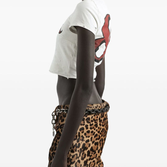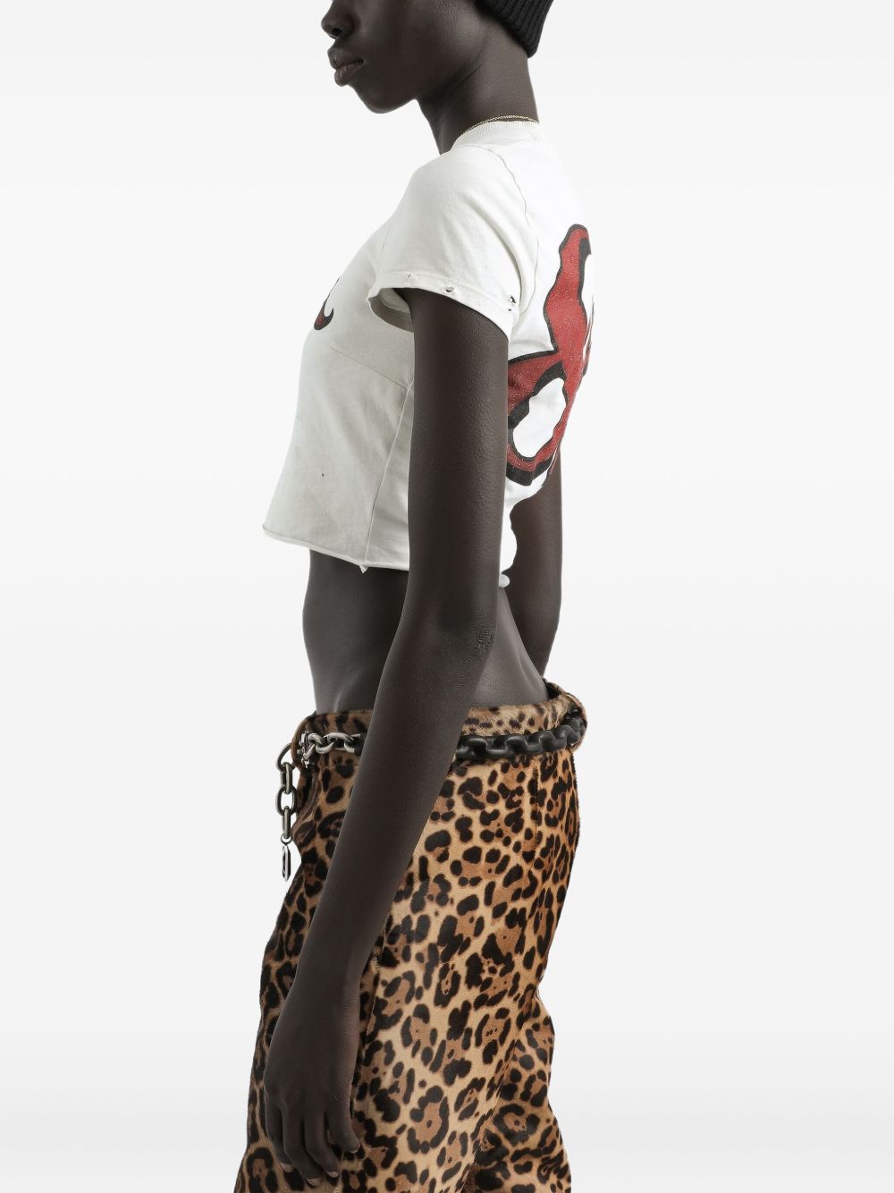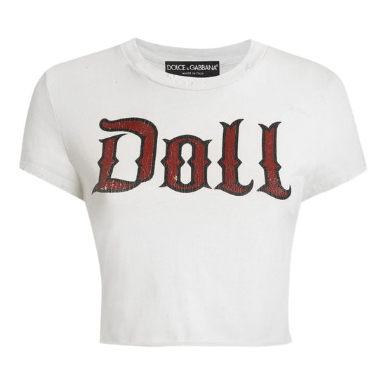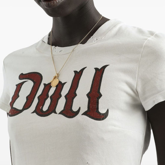 Off-white doll print short sleeves cropped hem distressed edges round neck printed cotton t-shirt