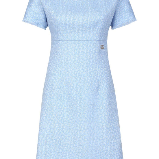 Sky blue bouclé construction a-line appliqué logo frayed edge crew neck concealed rear zip fastening short sleeves above-knee length straight hem rachel tweed dress with dg logo