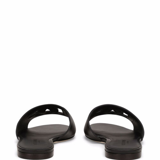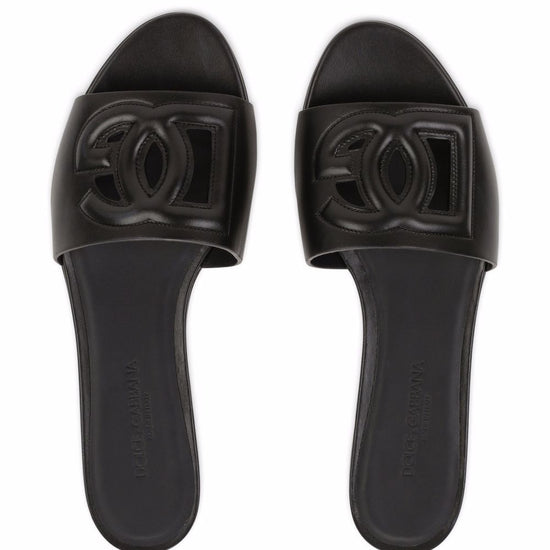 Black calf leather dg millennials logo slides from dolce & gabbana featuring embossed logo to the front, cut-out detailing, almond toe, branded insole and flat rubber sole. this piece fits small – take one size up. dg logo leather flat sandals