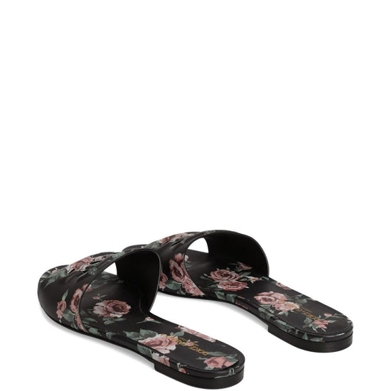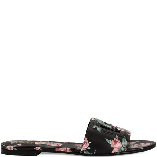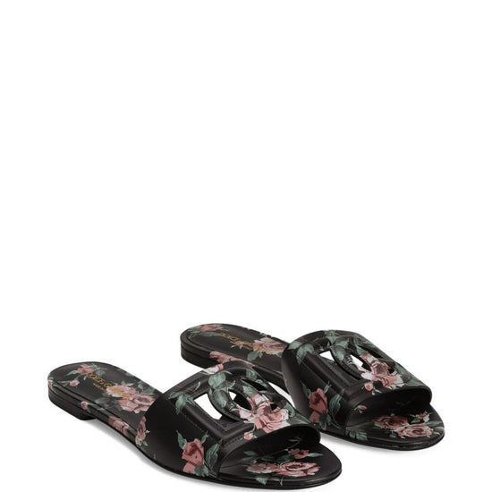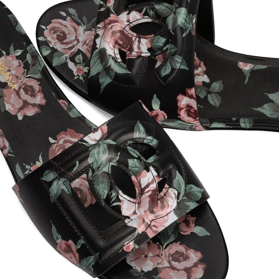 Black floral print logo detail open toe flat sole dg logo leather flat sandals