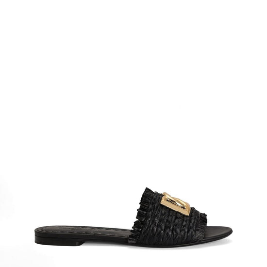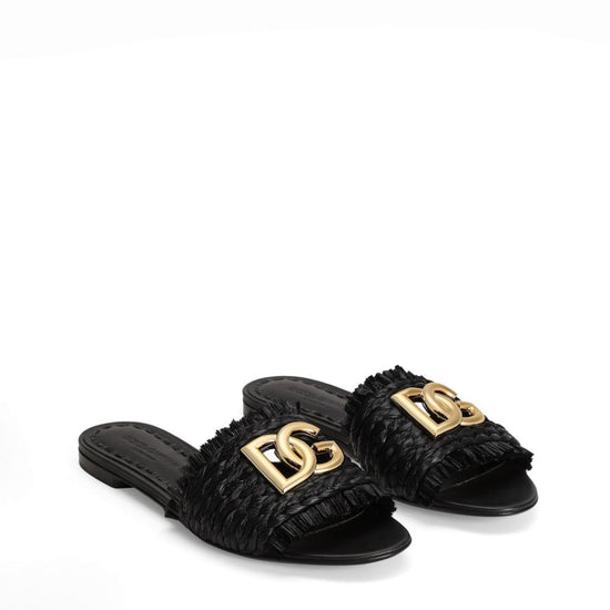 Black woven upper gold-tone logo open toe slip-on style flat sole leather sole with dg branding texon insole open toe leather insole customized with fire stamp customization with dg crossed logo vintage brass plating item equipped with black cotton bag and black embossed box dg logo rafia flat sandals