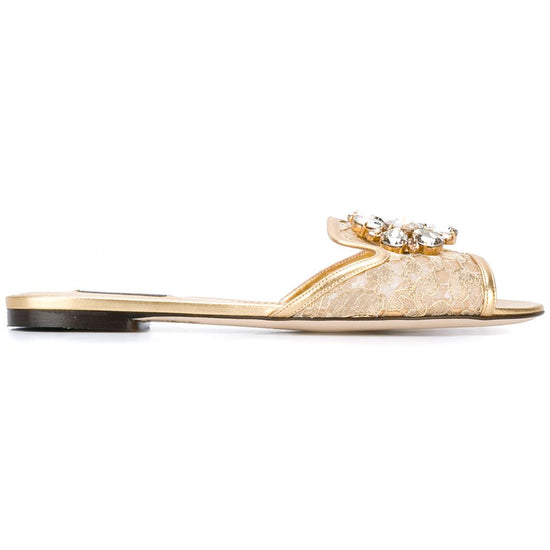 Gold tone bianca crystal-embellished lace sandals from dolce & gabbana featuring an open toe, a floral lace pattern, a leather sole and crystal embellishments. rainbow flat lace sandals size and fit - heel 0,6 in / 1,5 cm