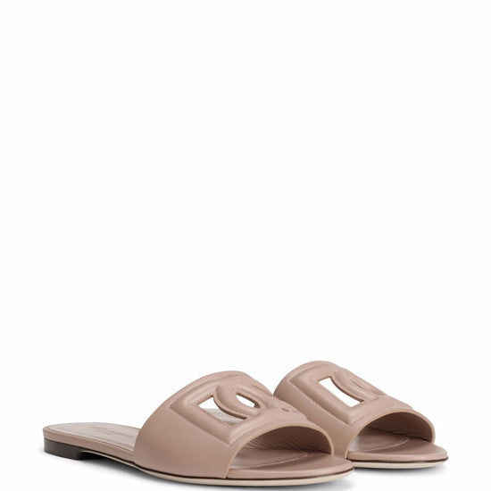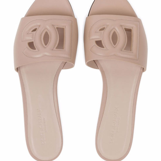 Powder pink calf leather embossed logo to the front cut-out detailing almond toe branded insole flat rubber sole dg logo leather flat sandals size and fit - heel 0,5 cm