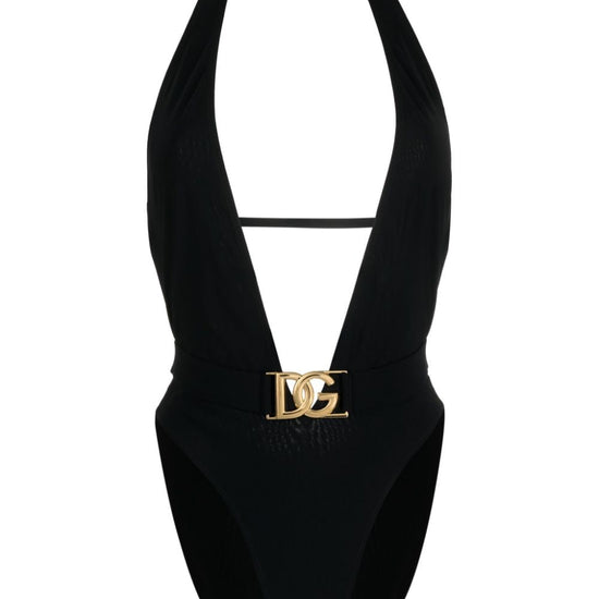 Black stretch-design gold-tone logo plaque plunging v-neck halterneck rear clasp fastening low back be mindful to try on swimwear over your own garments. swimsuit
