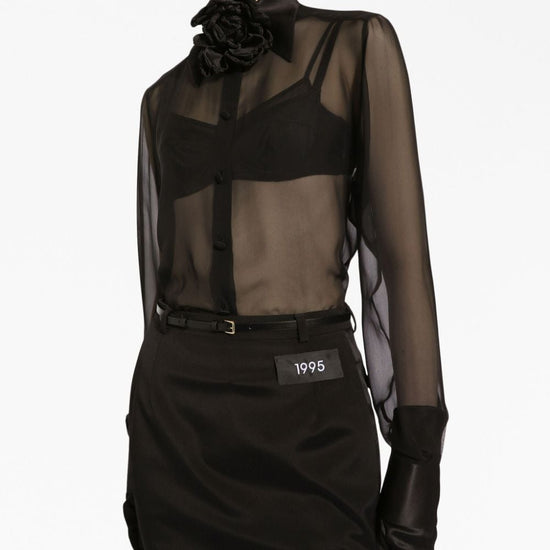 Semi-sheer mesh shirt from dolce & gabbana featuring black, silk blend, semi-sheer construction, mesh panelling, floral appliqué, spread collar, front button fastening, long sleeves, buttoned cuffs and straight hem. m/l, velata silk shirt size and fit - this piece fits true to size. we recommend you get your regular size. model is 1,75m / 5ft 8in wearing size 40 (it)