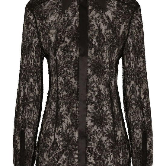 Semi-sheer floral-lace shirt from dolce & gabbana featuring black, semi-sheer construction, floral-lace detailing, classic collar, front button fastening, long sleeves, buttoned-cuff sleeves and scallop hem. lace shirt size and fit - this piece fits true to size. we recommend you get your regular size. model is 1,75m / 5ft 8in wearing size 40 (it)