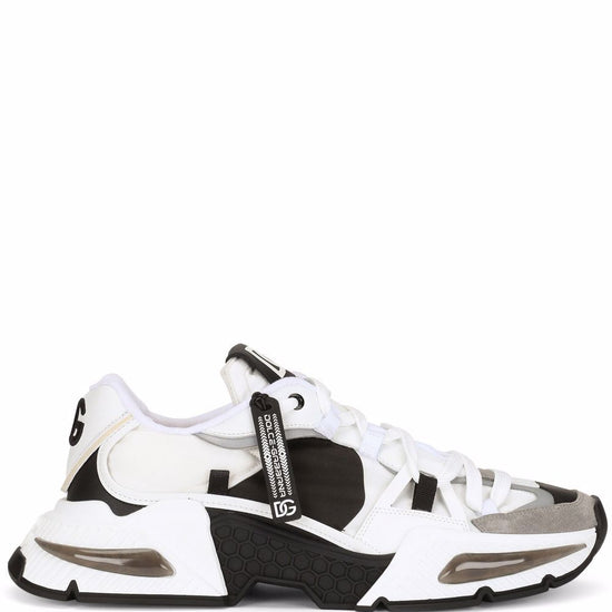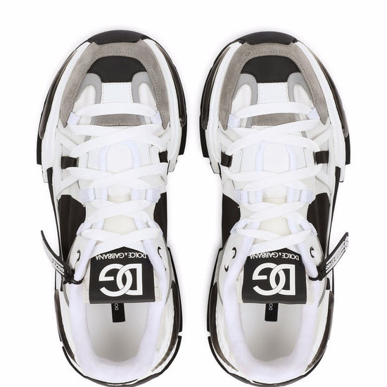 White/grey/black calf leather/lambskin airmaster panelled low-top sneakers from dolce & gabbana featuring panelled design, logo patch at the tongue, round toe, front lace-up fastening and chunky rubber sole. airmaster sneakers