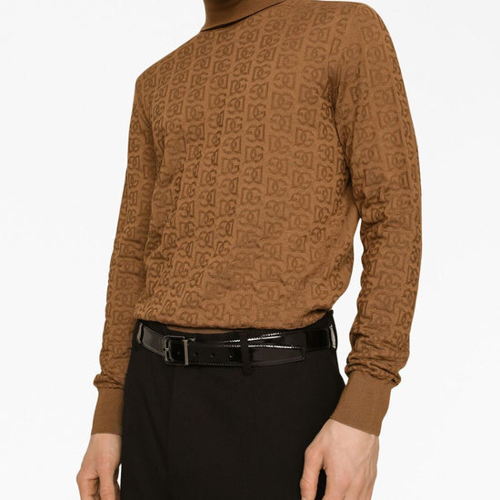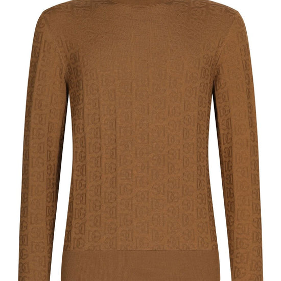 Logo-embroidery knitted top from dolce & gabbana featuring camel brown, silk, knitted construction, all-over logo embroidery, high neck, long sleeves, ribbed cuffs and hem and straight hem. dolcevita silk turtle-neck sweater size and fit - this piece fits true to size. we recommend you get your regular size. model is 1,84m / 6ft 1in wearing size 48 (it)