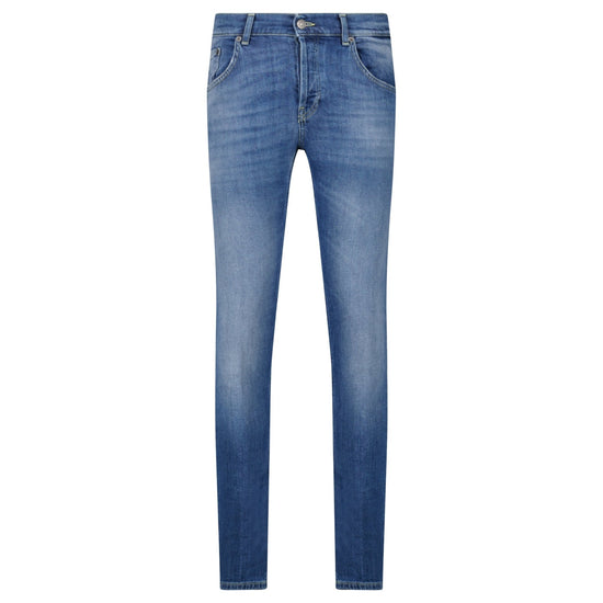 elevate your wardrobe with the dondup 'mius' blue slim fit jeans. crafted in italy from lightweight 9 1/4 oz stretch denim, this versatile pair offers comfort and a refined silhouette. designed with a low waist and slim fit, the clean medium-blue wash brings a timeless appeal that works effortlessly from day to night. finished with the signature dondup logo, these jeans combine premium materials with modern italian craftsmanship. ideal for smart-casual dressing, the mius jeans are a wardrobe essential.
