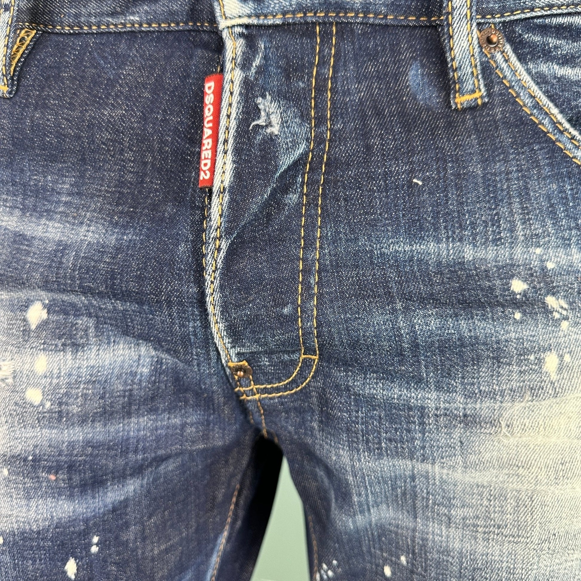 elevate your denim collection with the dsquared2 'cool guy jean' distressed white paint jeans in blue. expertly crafted in italy, these jeans are made from a premium blend of 98% cotton and 2% elastane, offering both comfort and flexibility. the jeans feature a faded and stained effect that adds an edgy, lived-in look to the classic blue colour. accented with the dsquared2 brand logo and decorative studs, these jeans combine traditional denim aesthetics with bold, contemporary detailing.