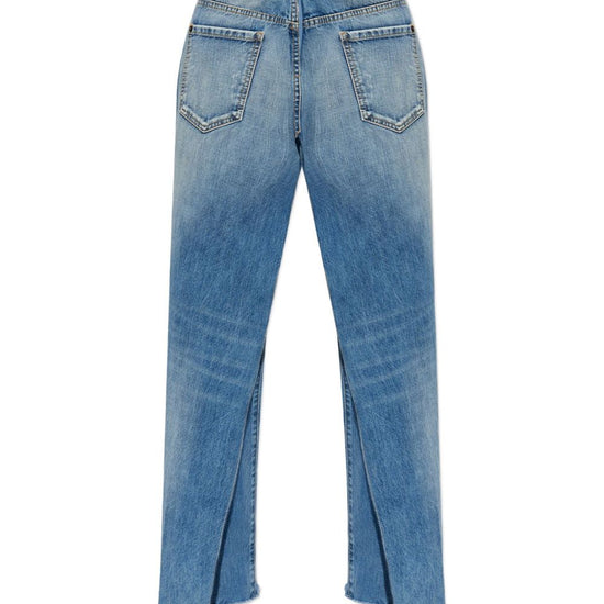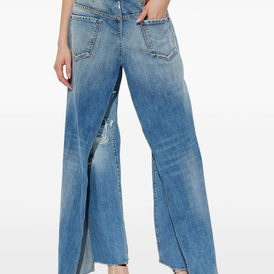 Light blue cotton frayed hem classid five pockets rear logo patch sash detail layered denim jeans