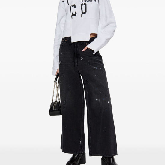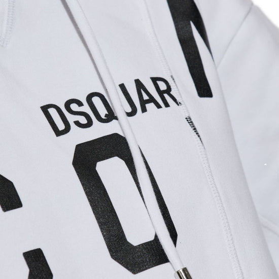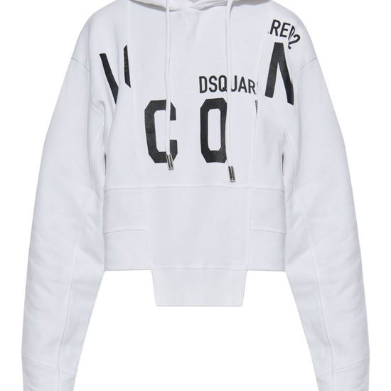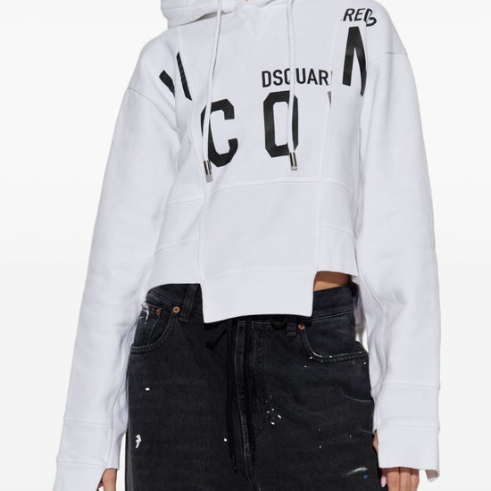 White drawstring hood logo print long sleeves panelled design asymmetric hem cotton cotton cropped hoodie