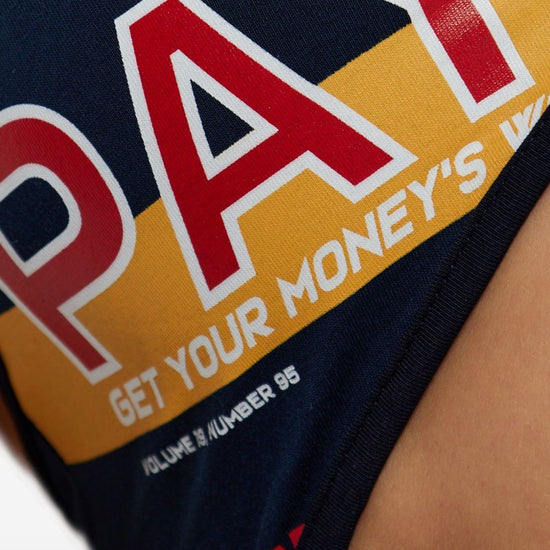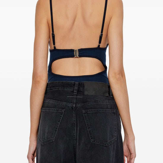 Dark blue/multicolour slogan print cut-out detail adjustable spaghetti straps clasp fastening high-cut legs cotton printed bodysuit