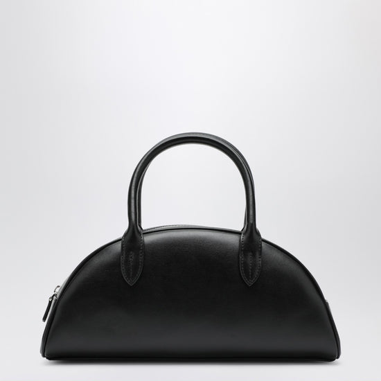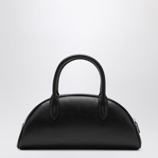 Black leather handbag by dunst with two top handles, half-moon shape, top zip closure, removable shoulder strap and one flat inner pocket. size and fit - width 32 cm x height 15 cm x depth 9 cm adjustable shoulder strap length min 97 cm - max 120 cm handle drop: 10 cm