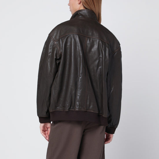 Dark brown leather vintage effect bomber by dunst, characterized by a front zip closure, ribbed knit edges, two applied pockets on the front with flap and two side pockets. size and fit - model wears size s model measurements: height: 182 cm chest: 79 cm waist: 62 cm hips: 90 cm