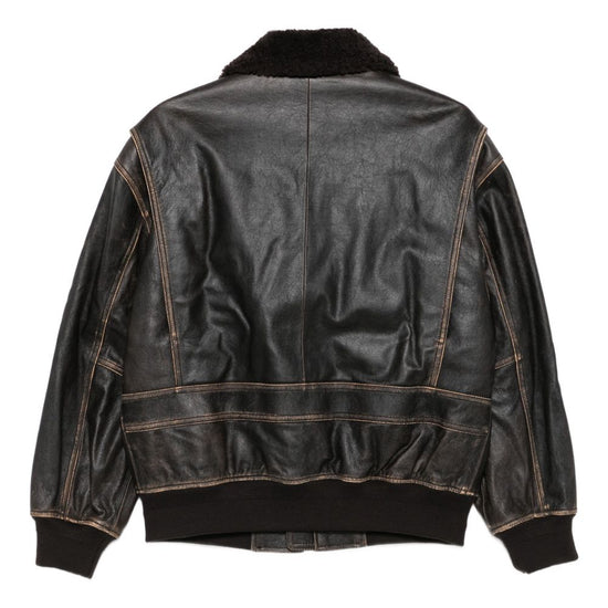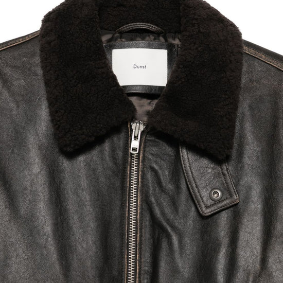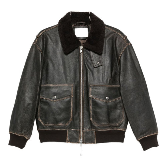 Brown shearling collar zip fastening front pockets ribbed hem ribbed cuffs leather shearling jacket