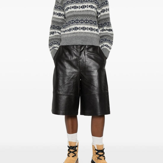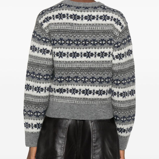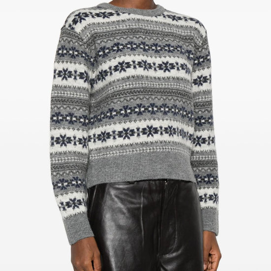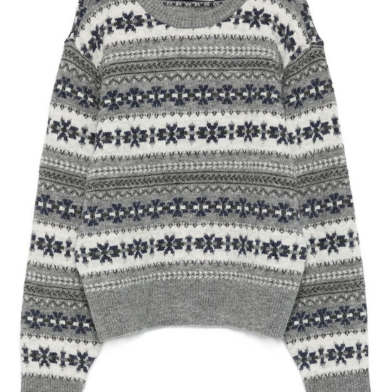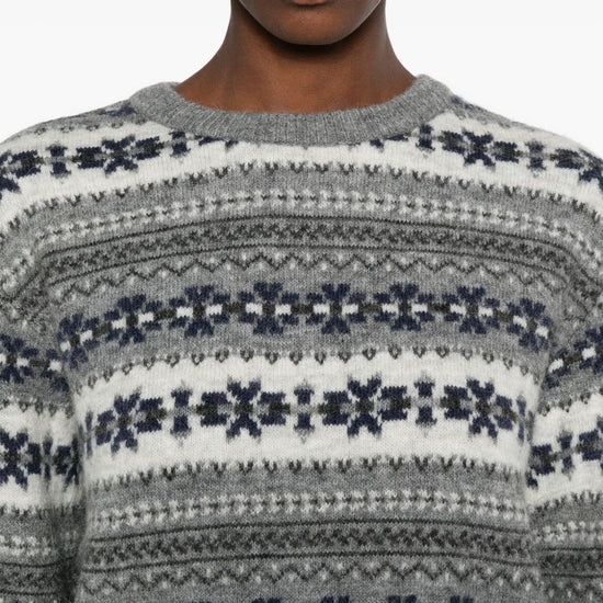 Grey fairisle pattern round neck long sleeves ribbed cuffs ribbed hem wool blend crewneck jumper